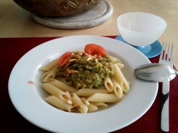 Nudeln mit Zucchini-Creme und Pinienkernen